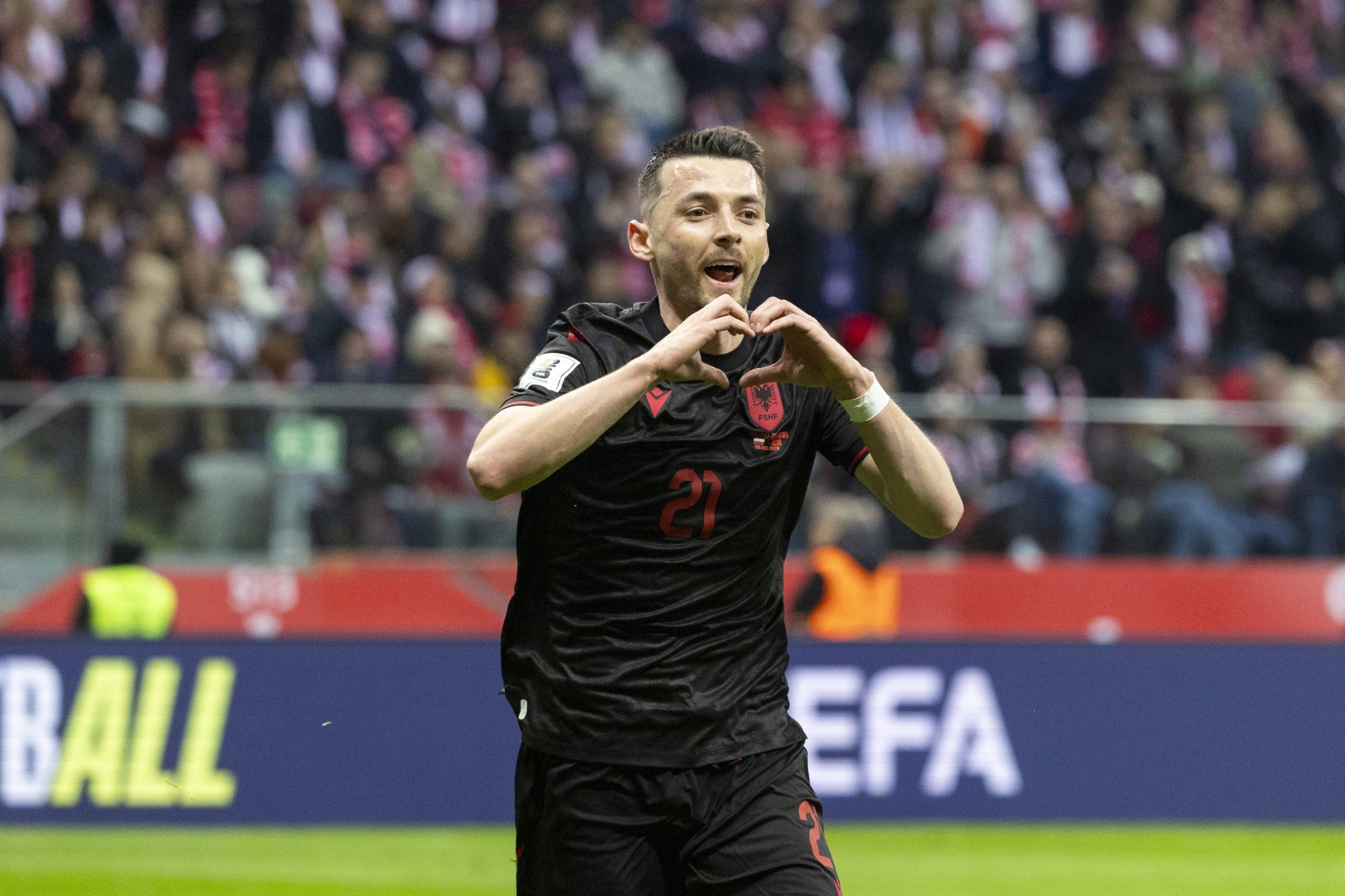 Cara a cara com o goleiro aos 42 minutos do segundo tempo, Hoxha driblou Kamil Grabara, empurrou para o fundo das redes e saiu comemorando com a águia de duas cabeças, símbolo central da bandeira da Albânia. Este foi apenas o segundo gol do atacante do Dínamo de Zagreb com a camisa da seleção albanesa.