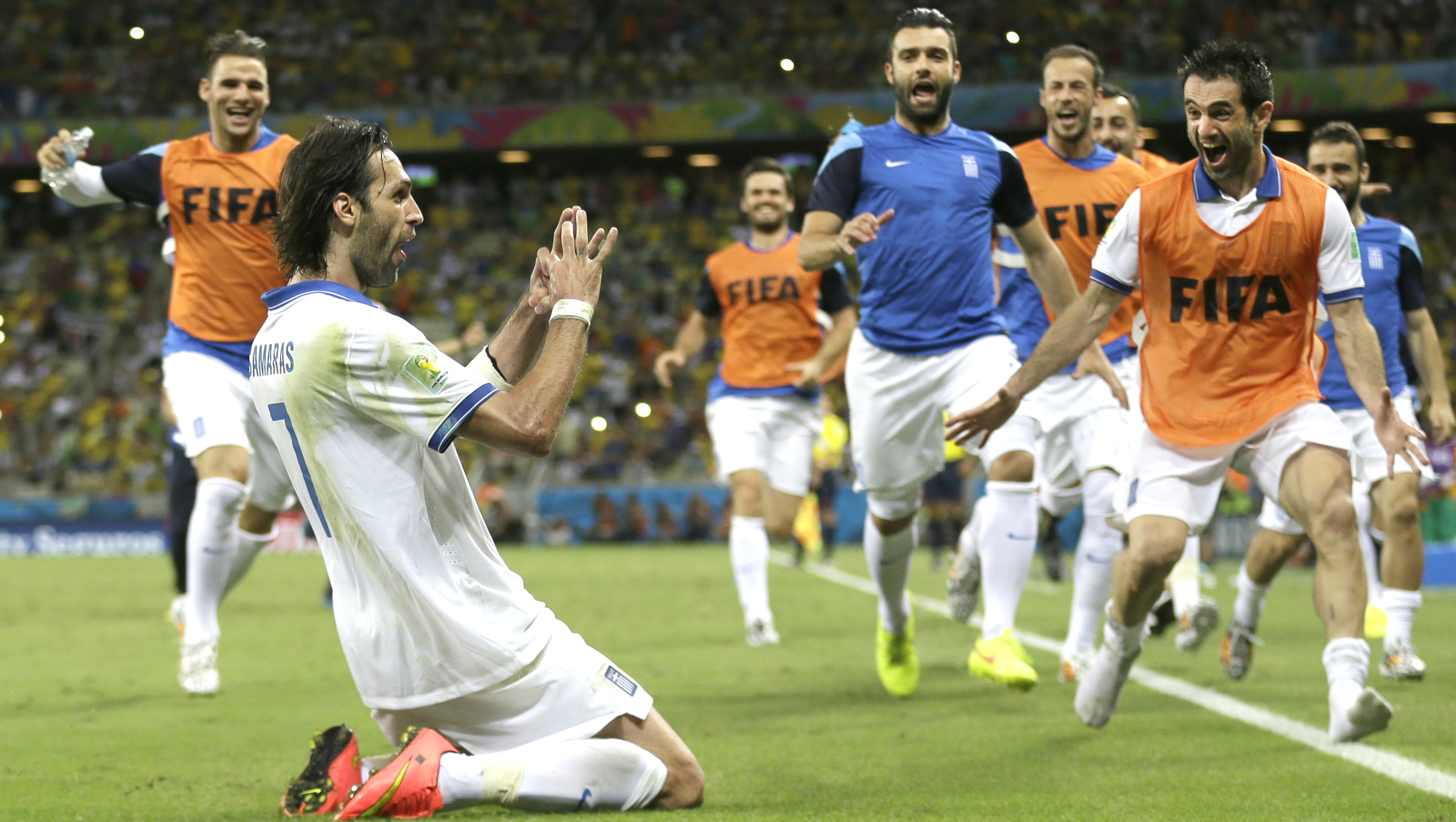 Quando a quase classificação dos gregos parecia mesmo ter ido para o espaço e a Costa do Marfim ia confirmando a vaga nas oitavas de final, o inacreditável tomou conta do Castelão. Aos 46 minutos, Georgios Samaras recebeu a bola dentro da área, se ajeitou para a finalização e, antes que pudesse atingir a bola, Giovanni Sio colocou o pé entre o do grego e a bola, impedindo o chute e cometendo o pênalti.