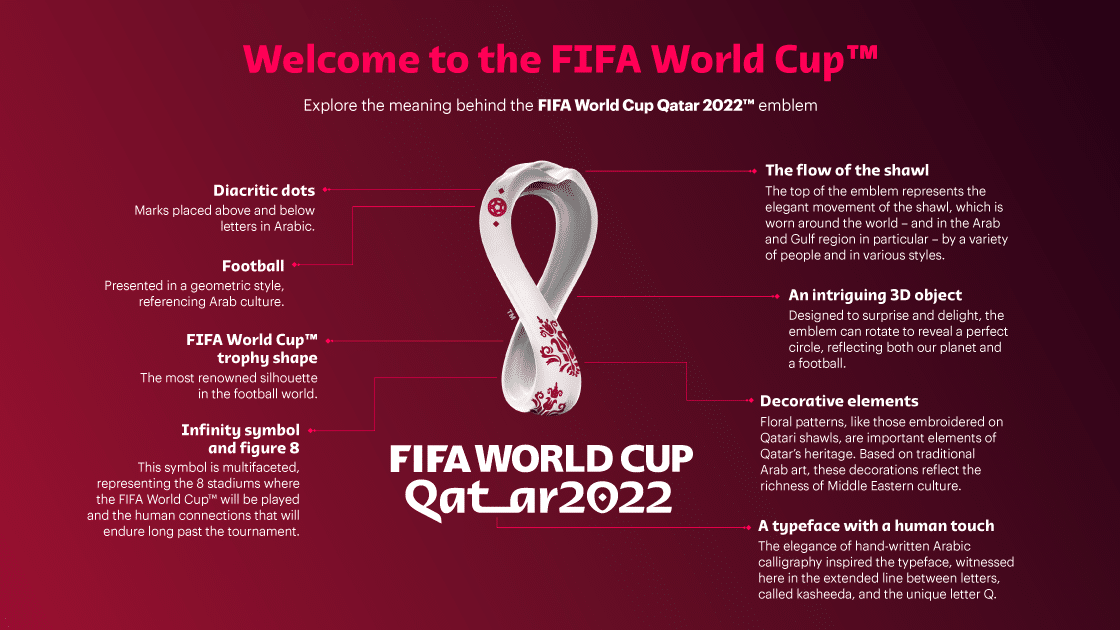 Segundo comunicado do Comitê Supremo para Entrega e Legado (o nome dado ao Comitê Organizador Local da Copa do Catar), “o emblema foi inspirado nos tradicionais xales de lã usados durante os meses de inverno – quando a Copa do Mundo Fifa 2022 ocorrerá – no Catar e em todo o mundo. Como o futebol, a popularidade dos xales é uma força unificadora, tecida no tecido cotidiano da vida das pessoas”.