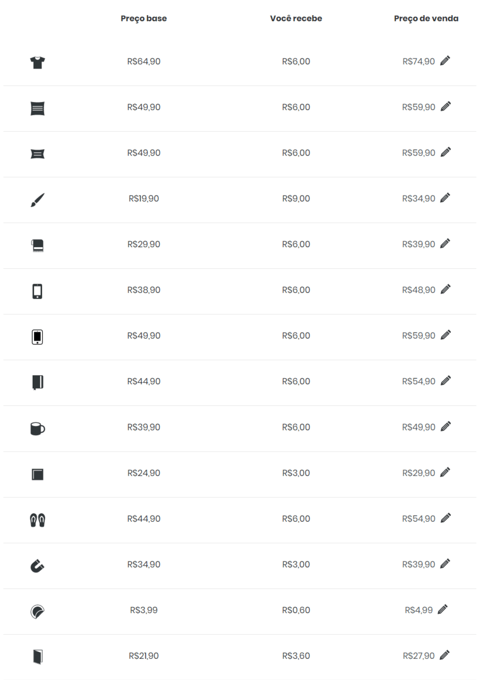 Abaixo, a tabela de preços, com a discriminação de preço-base e o lucro que temos em cada um dos produtos.