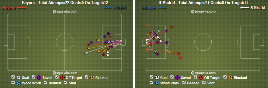 Manuel Neuer e Iker Casillas não tiveram culpa nos gols sofridos. Klaas-Jan Huntelaar acertou um chute indefensável contra o Real, enquanto Rafinha deixou seu companheiro vendido. Entretanto, os dois goleiros tiveram trabalho contra o Schalke. Neuer fez quatro defesas, três delas bastantes difíceis no final do primeiro tempo. Já Casillas salvou três delas, uma realmente milagrosa, em chute na pequena área. Em compensação, os defensores do Real tiveram mais trabalho, com 18 a 8 nos desarmes e 13 a 16 nas interceptações.