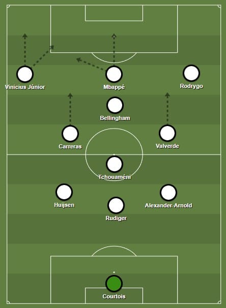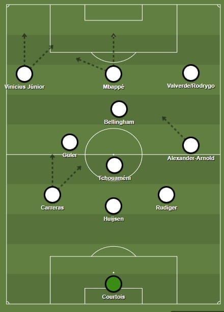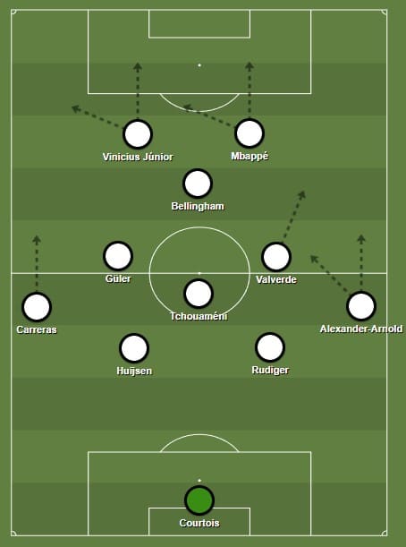No contexto do Real Madrid atuando por dentro como meia ou como terceiro zagueiro na saída de bola, deixaria o corredor para Vinicius Júnior, provavelmente em um 4-3-3, como Alonso fez nos dois jogos iniciais do Mundial (empate com Al-Hilal e vitória por 3 a 1 sobre o Pachuca). Sua posição, avançada ou recuada, impactaria diretamente como Alexander-Arnold atuaria do outro lado.