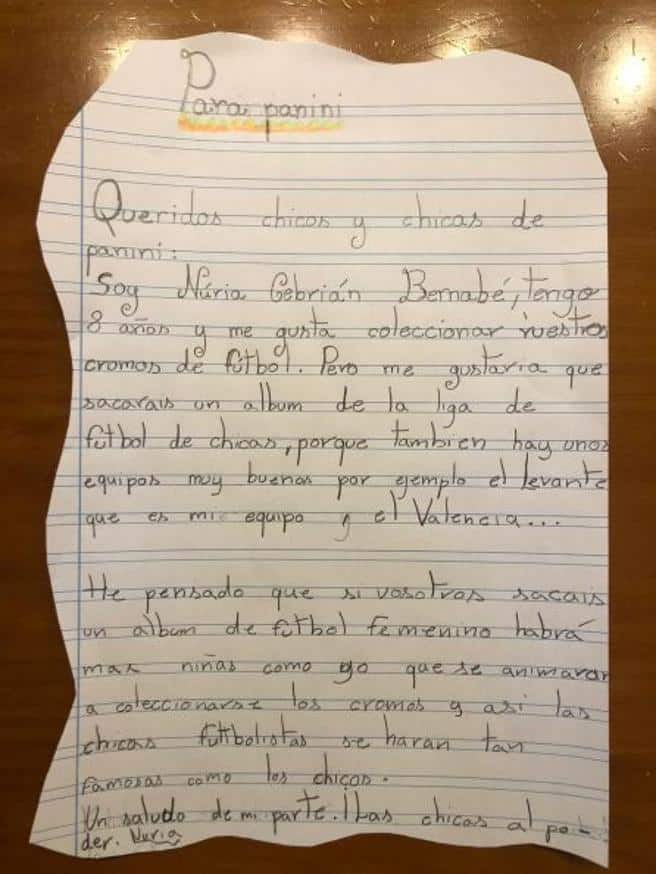 Em Valencia, na Espanha, a pequena Nuria Cebrián Bernabé, de 8 anos, é torcedora fiel do Levante, equipe da primeira divisão espanhola. Assim como outras crianças de sua idade, Nuria usa parte de seu tempo para colecionar figurinhas do álbum de futebol feminino? Nuria decidiu, então, escrever uma carta para a Panini, gigante dos cromos colecionáveis, afinal, a Liga Iberdrola, o campeonato espanhol feminino “também tem equipes muito boas, como o Levante, por exemplo”.
