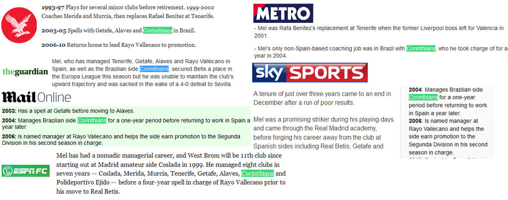 Sites como ESPN FC, Daily Mail, Independent, Metro, Guardian e Sky Sports incluíram em suas notas o período de um ano em que Pepe Mel passou longe do futebol espanhol e treinou o Corinthians – o que nunca aconteceu, claro. Se fosse apenas um portal, já seria uma gafe digna de atenção, mas o fato de cinco veículos terem cometido o mesmo erro básico é simplesmente bizarro.