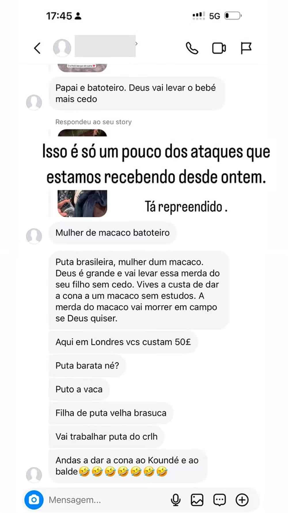 Em um dos prints compartilhados, ela também é ofendida. “P*ta brasileira, mulher dum macaco, Deus é grande e vai levar essa m*rda do seu filho bem cedo”, diz uma das mensagens.