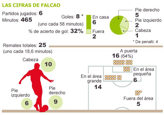 No número de partidas necessárias para somar oito gols Falcao também leva vantagem: disputou seis, contra sete dos outros dois. Fora ter saído no intervalo diante do Valladolid e aos sete minutos do segundo tempo contra o Betis.