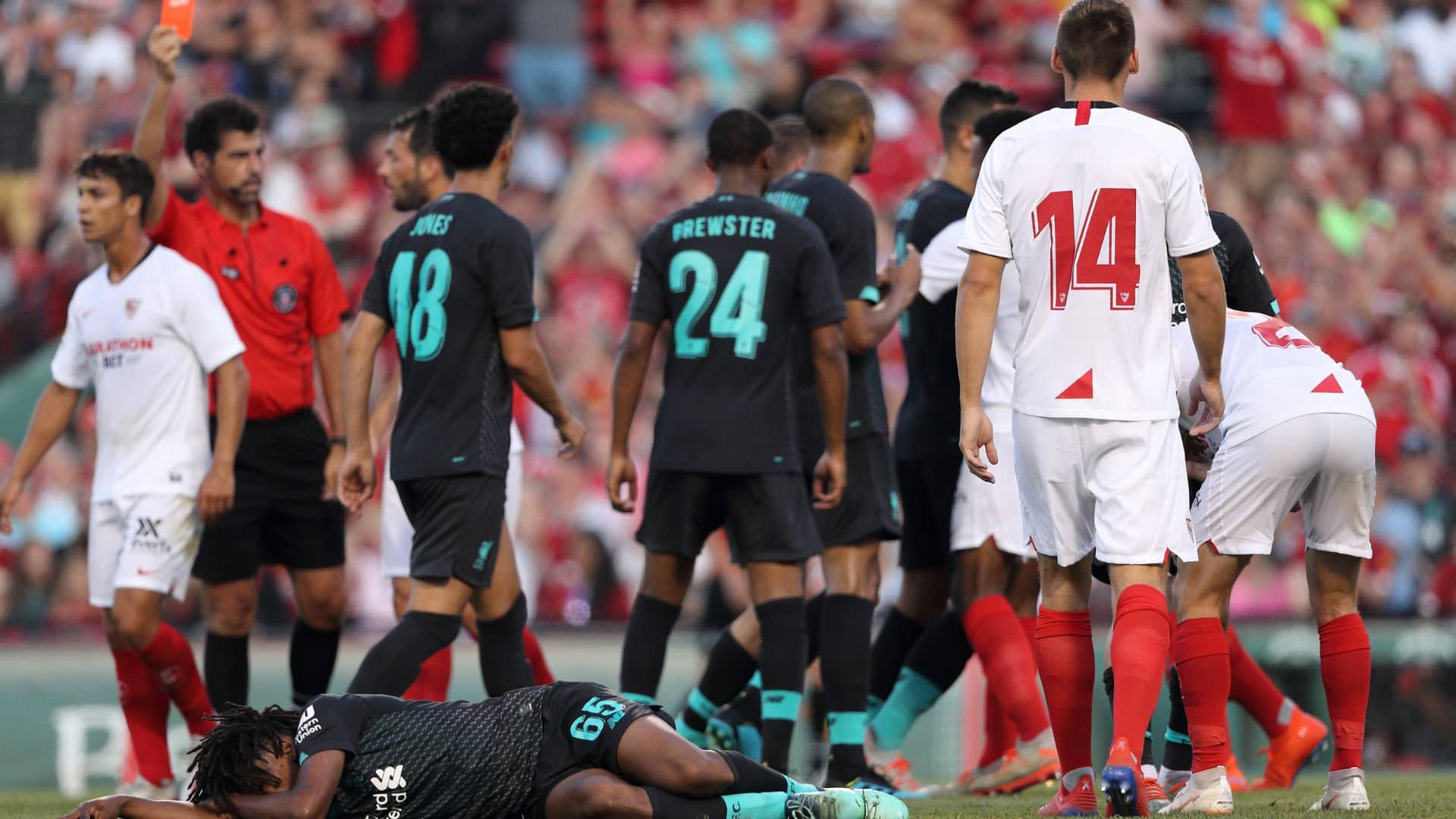A vitória do Sevilla por 2 a 1 sobre o Liverpool, em amistoso no último domingo, em Boston, teve uma cena bem forte. Por volta dos 30 minutos, o defensor francês Joris Gnagnon, do time espanhol, deu um feio pontapé no jovem Yasser Larouci, que caiu se contorcendo de dor, foi retirado de maca e precisou deixar o estádio Fenway Park de muletas.