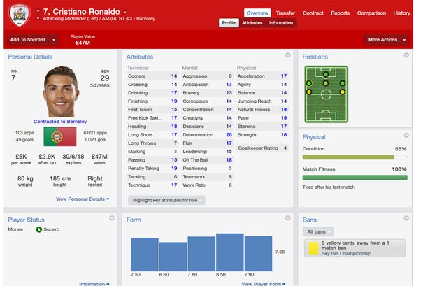 Se a ideia do Mirror era testar os três candidatos à Bola de Ouro da Fifa, Cristiano Ronaldo se saiu melhor, como deve acontecer também na cerimônia de segunda-feira que vem. Ele levou o Barnsley da lanterna para a 15ª posição com 17 gols. Fez dois no mesmo jogo seis vezes e ainda anotou um hat-trick.