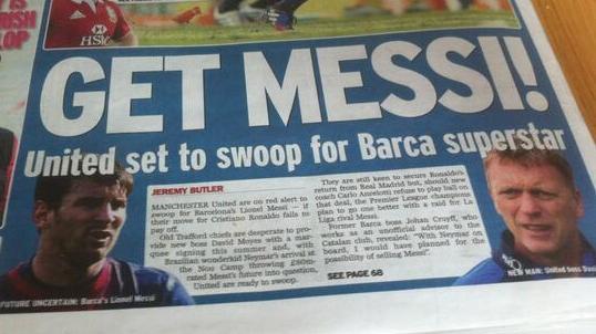 “O Manchester United está em alerta vermelho para trazer Lionel Messi, caso a transferência de Cristiano Ronaldo não aconteça. Os chefes de Old Trafford estão desesperados por uma contratação marcante a David Moyes e, com a chegada de Neymar ao Camp Nou deixando Messi em questionamento, o United está pronto para trazê-lo”, afirmou o jornal de Belfast, reproduzindo a frase de Cruyff sobre a incompatibilidade de Messi e Neymar, bem como colocando o ex-técnico como um personagem ainda influente nos bastidores do clube.