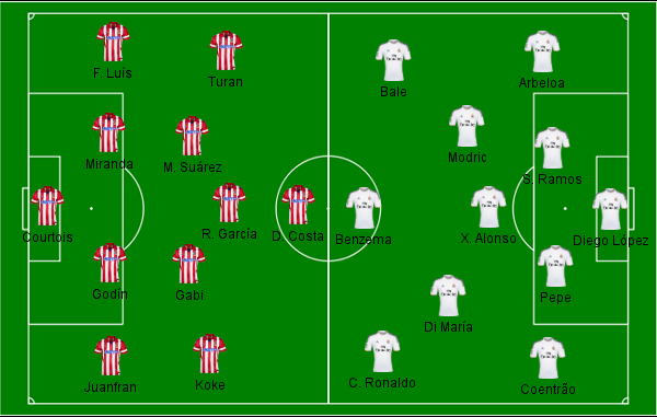 Diego López, Álvaro Arbeloa (Dani Carvajal, 26’/2T), Pepe, Sergio Ramos e Fábio Coentrão (Marcelo, 14/2T); Xabi Alonso, Luka Modric e Ángel Di María (Isco, 27’/2T); Gareth Bale, Karim Benzema e Cristiano Ronaldo. Técnico: Carlo Ancelotti.
