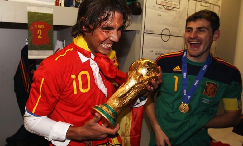 Após a vitória por 1 a 0 contra Holanda em Joanesburgo, Rafael Nadal tirou fotos com jogadores como Iker Casillas e Sergio Ramos, e apareceu em algumas imagens com o troféu na mão.