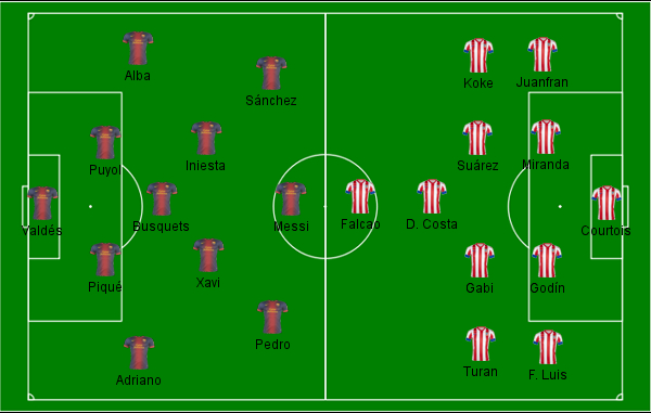 Sem Cesc Fàbregas, lesionado, o Barcelona começou com Alexis Sánchez no ataque e Andrés Iniesta de volta ao meio. Já na defesa, Tito Vilanova optou por Carles Puyol e Gerard Piqué no miolo, além de Adriano na lateral direita. Já Diego Simeone optou uma formação no 4-4-2, com Diego Costa acompanhando Radamel Falcao García na linha de frente.