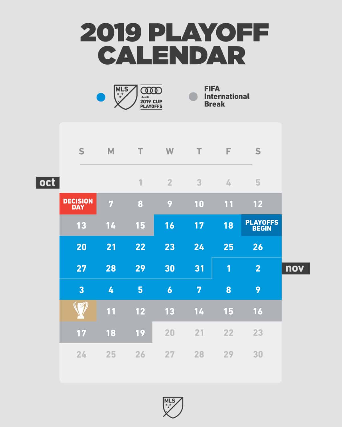 Com as mudanças, a MLS terá a sua última rodada da fase regular no dia 6 de outubro, antes da data Fifa de outubro. Os playoffs começam no dia 19, depois do fim desta mesma data Fifa. Serão três semanas de jogos até a grande final, no dia 10 de novembro. A data Fifa de novembro começa logo em seguida e, assim, não atrapalha os times. A temporada regular terminará mais cedo do que em 2018, mas começará na mesma época: início de março. O calendário ganha alguma folga.