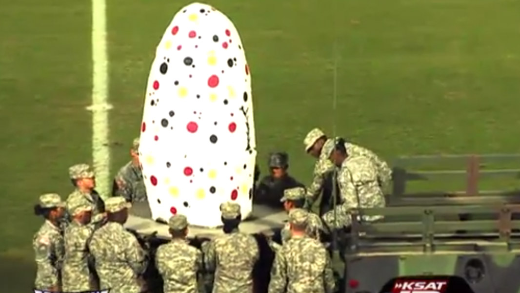 Valeu a pena a espera. O ovo entrou em campo em um jeep do exército, com mais de uma dezena de “soldados” na escolta. Parou no círculo central e os homens e mulheres tiveram todo o cuidado do mundo para ele não quebrar antes da hora. Já no gramado, o mascote começou a quebrar a casca e foi se revelando aos poucos.