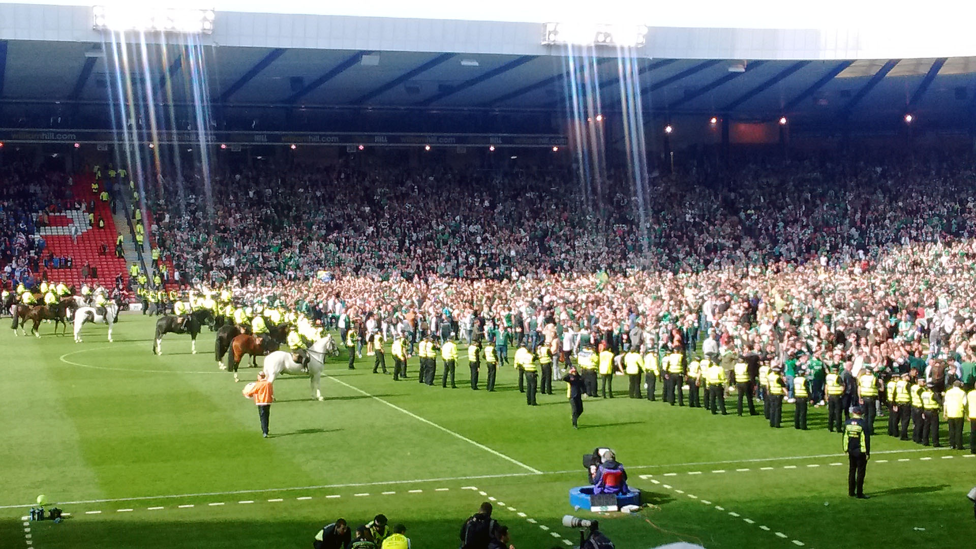 O apito final de Steven McLean foi o estopim para a invasão dos Hibees ao gramado do Hampdem Park. Eles queriam estar com seus heróis em campo, estar com aqueles que quebraram os 114 anos de jejum na Scottish Cup após 10 derrotas em finais no período. Porém, eles também queriam provocar o adversário e sua numerosa torcida.