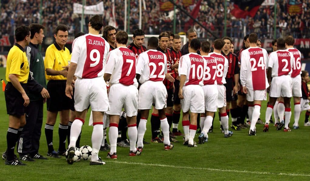 O Ajax tinha alguns desfalques sentidos para aquela primeira partida. Van der Meyde estava suspenso, enquanto Mido havia deixado o clube semanas antes por entrar em rota de colisão com Koeman. Ainda assim, um time interessante foi escalado, com: Lobont, Trabelsi, Chivu, Pasanen, Maxwell; Galásek, O’Brien, Van der Vaart; Abubakari Yakubu, Ibrahimovic e Pienaar. O problema era medir forças com um Milan recheado de lendas, de Dida a Shevchenko, passando por Nesta, Maldini, Costacurta, Rui Costa, Gattuso, Seedorf e Inzaghi. E o timaço rossonero poderia ter saído com o saldo melhor já em Amsterdã. O empate por 0 a 0 prevaleceu na Johan Cruijff Arena, com os italianos forçando boas defesas de Lobont. Apesar do toque de bola e do domínio durante a maior parte do tempo, os Godenzonen não conseguiram criar grandes perigos para romper a linha de zaga milanista.