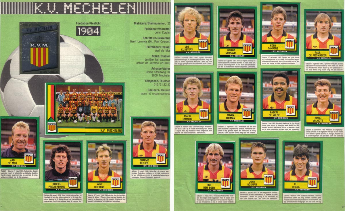 Fundado em 1904, o Kooninklijke Voetbal Mechelen chegou à divisão de elite do futebol belga no começo dos anos 20 e viveu seu primeiro auge duas décadas depois, quando levantou por três vezes o título nacional, em 1943, 1946 e 1948. O time da cidade de Mechelen, localizada na província de Antuérpia e também conhecida pelo nome em francês, Malines, ainda apresentaria campanhas consistentes até meados dos anos 50, mas daí em diante se apequenaria por um longo período, com campanhas discretas e rebaixamentos, até ressurgir para viver seu período mais celebrado em meados da década de 1980.