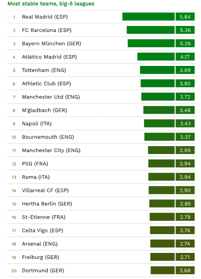 Os 20 clubes mais estáveis das cinco principais ligas europeias