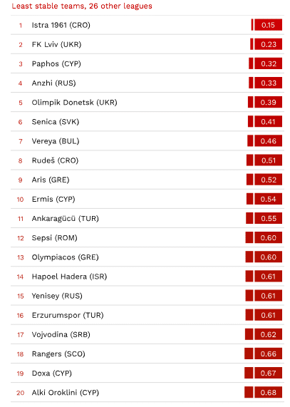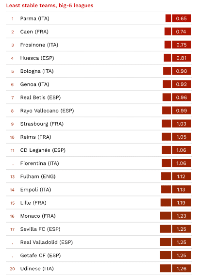 Os 20 clubes menos estáveis das cinco principais ligas europeias