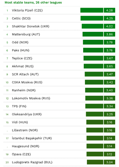 Athletic Bilbao (3,80), com regras rígidas de contratações, Manchester United (3,72), Borussia Monchengladbach (3,48), Napoli (3,43) e Bournemouth (3,37) completam os dez times das principais ligas europeias que trocam menos os seus jogadores. Fora da elite europeia, destacam-se o Viktoria Plzen (4,28), Celtic (4,25), Shakhtar Donetsk (4,02), Mattersburg (3,86), da Áustria, e Odd (3,78), da Noruega.