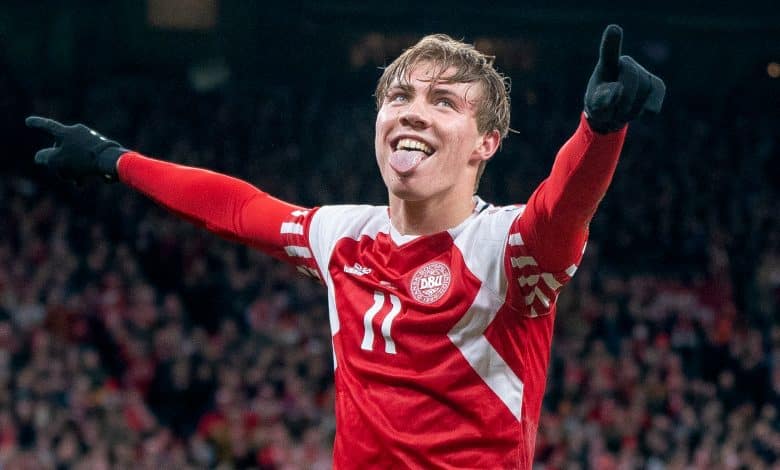 Hojlund marcou pela primeira vez com a camisa da Dinamarca – e foram logo três de uma vez