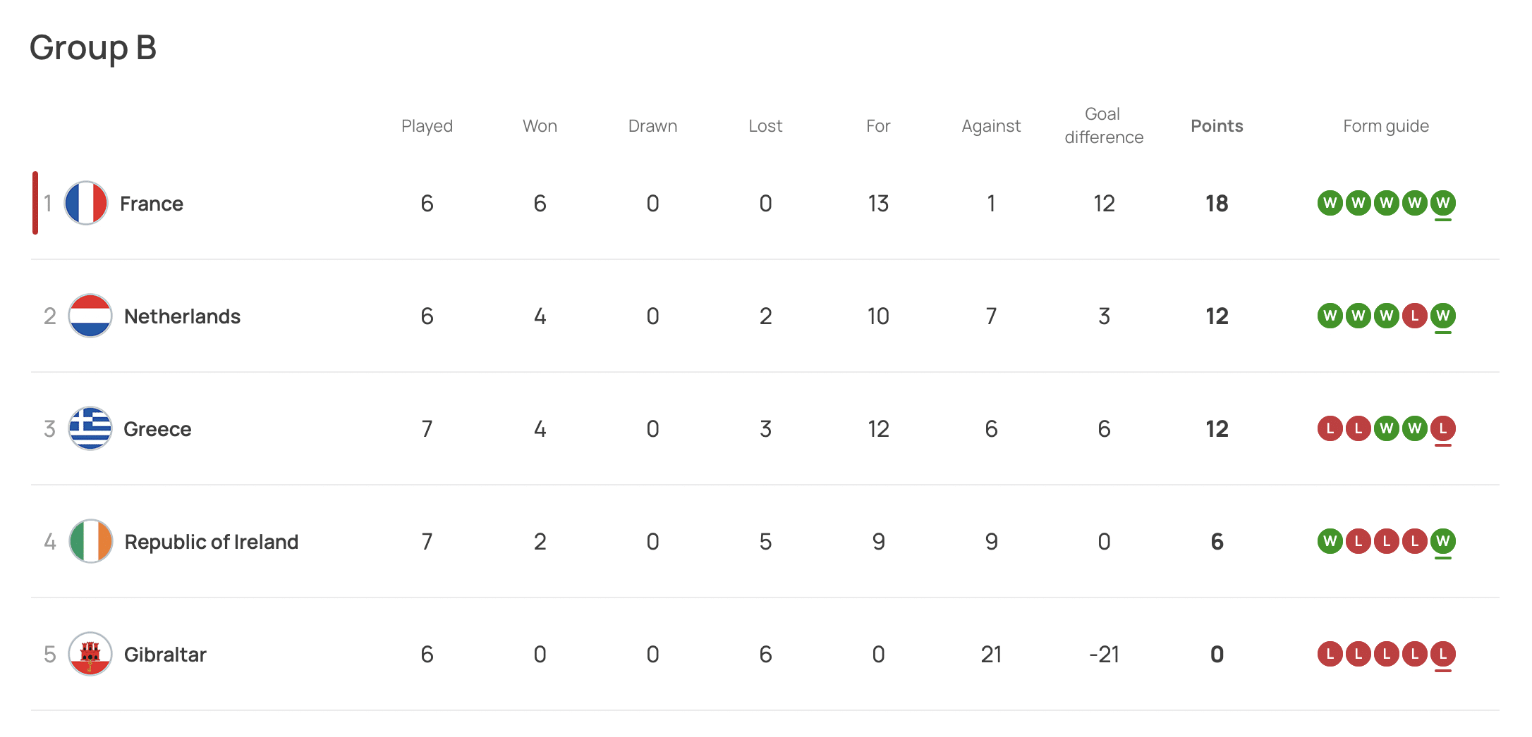 A França já ficou com uma vaga do Grupo B das Eliminatórias, enquanto a outra está sendo disputada por Holanda e Grécia. Como está na frente dos gregos e atrás dos holandeses no ranking da Nations League, a Irlanda teria mais chances de ir aos playoffs com uma classificação direta dos Países Baixos, que pode acontecer na próxima rodada.