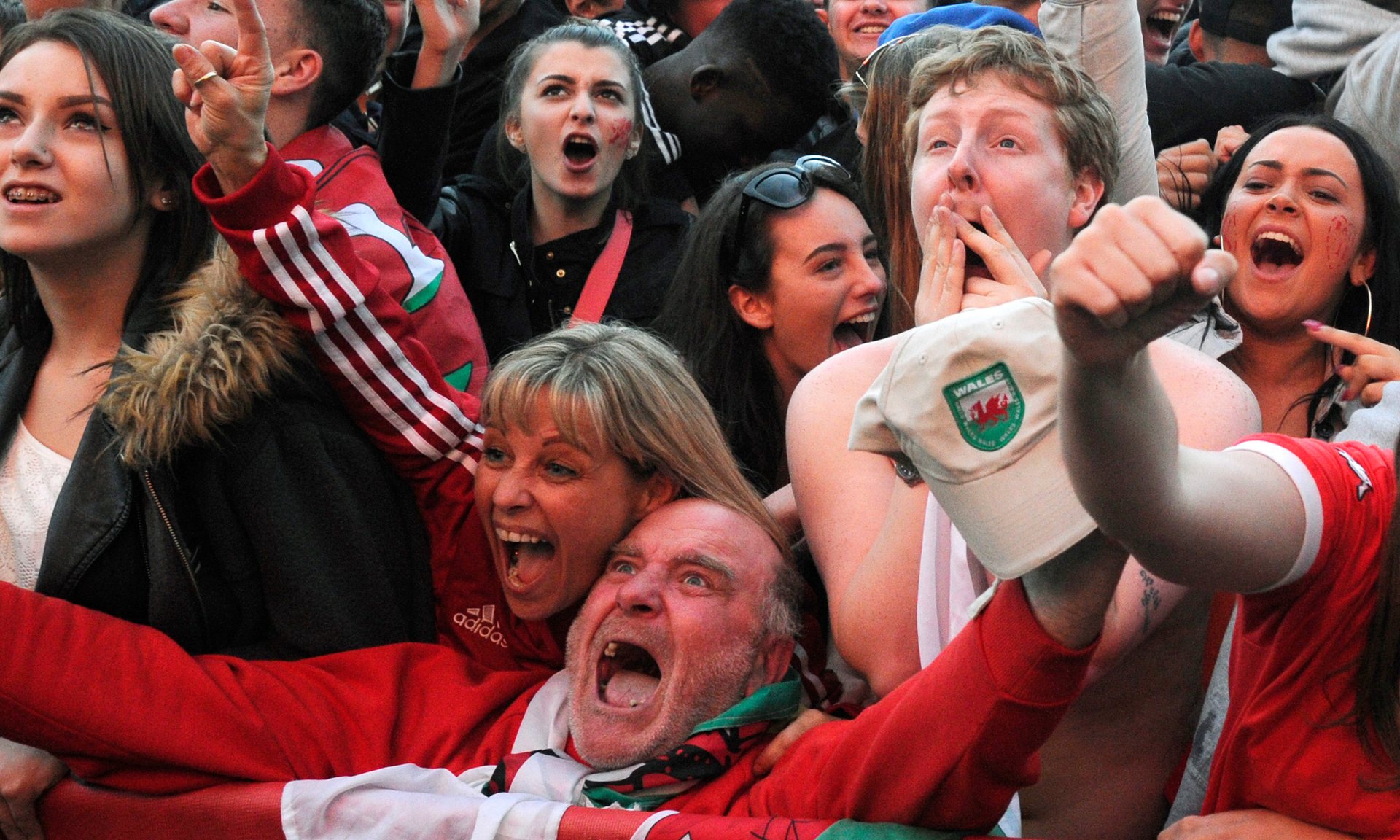 Em uma Eurocopa de tantas torcidas legais, Gales tem uma das melhores. Os Dragões fazem sua presença ser sentida facilmente nos estádios, e podem muito bem ser colocados como um dos motivos para o sucesso de sua seleção rumo às semifinais do campeonato. Pois o fanatismo que se vê em boas doses nas ruas francesas ganha proporções ainda maiores em seu próprio país. Milhares de galeses se reuniram nesta sexta para acompanhar o jogo contra a Bélgica, na fan fest em Cardiff. E a loucura foi total diante da vitória. Imagine a erupção de um povo apaixonado por futebol, em que a maioria absoluta das pessoas vê pela primeira vez a seleção disputando um torneio internacional, e logo alcançando tamanho sucesso. É o que as imagens abaixo retratam.