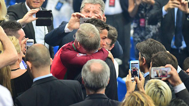 Alguns, como Pepe, Nani e o treinador Fernando Santos, foram parabenizados pelo escocês com abraços e apertos de mão. Mas o ex-técnico aguardava mesmo aquele que o próprio considera um dos quatro melhores jogadores que já treinou em seus ao longo de seus quase 40 anos de carreira. No momento em que o camisa 7 descia as escadas, a cena de um Ferguson ansioso para cumprimentar o jogador e entusiasmado com a situação remeteu aos brilhantes anos em que trabalharam juntos no Manchester United. “Cristiano!”, clamou sir Alex, que logo foi reconhecido com muito carinho pelo português.