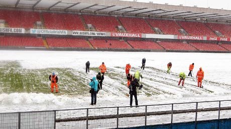 Está dificílimo para a Rússia enfrentar a Irlanda do Norte em Belfast, no Windsor Park. Pelo Grupo F das eliminatórias para a Copa de 2014, os adversários não encontram condições de jogo no gramado norte-irlandês.