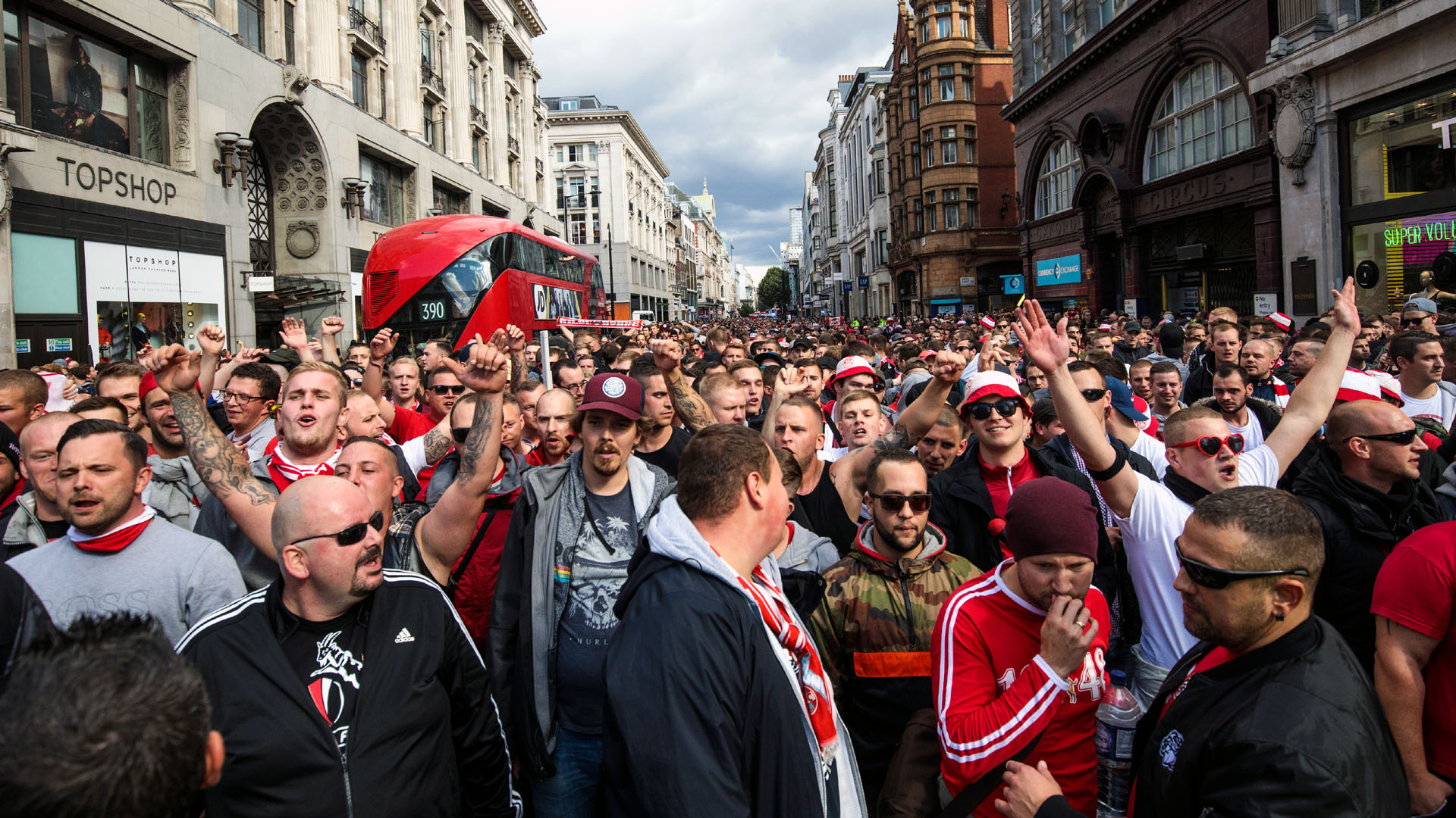 O dia é de jogo do Colônia fora de casa. E cerca de 20 mil torcedores fizeram uma longa caminhada na capital britânica para ir até o Emirates Stadium, onde o time enfrentará o Arsenal. Os torcedores foram andando pela rua Oxford, cantando, e com cachecóis do time. Estavam também com garrafas, mas a polícia londrina relata que não houve qualquer incidente de violência.