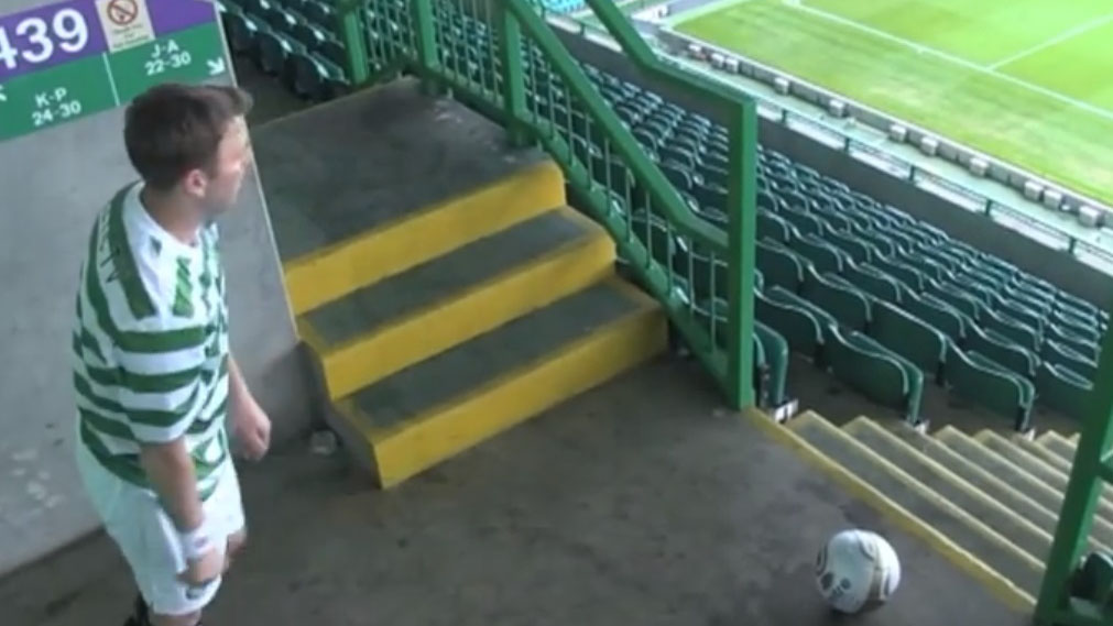 Um dos desafios mais impressionantes foi concretizado por esse canal de vídeos do Youtube especializado em truques de futebol. Em um vazio Celtic Park, o rapaz, por trás do gol, acerta o travessão da parte de cima das arquibancadas. Dá para ver toda a trajetória da bola, o que diminui as chances de ser uma mera ilusão cinematográfica.