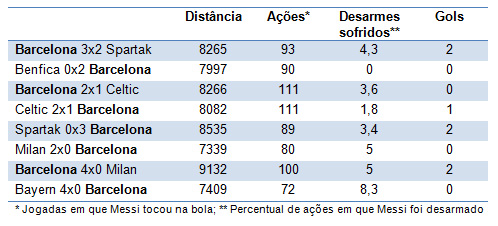 Veja as estatísticas de Messi contra o Bayern e nas demais partidas desta Liga dos Campeões em que ele ficou em campo durante os 90 minutos (ou seja, as partidas contra o Paris Saint-Germain na ida e na volta das quartas de final e no empate do Barça por 0 a 0 com o Benfica foram excluídas da conta). Foi o segundo jogo em que ele se movimentou menos e, de longe, o que ele menos pegou na bola e o que mais vezes foi desarmado.