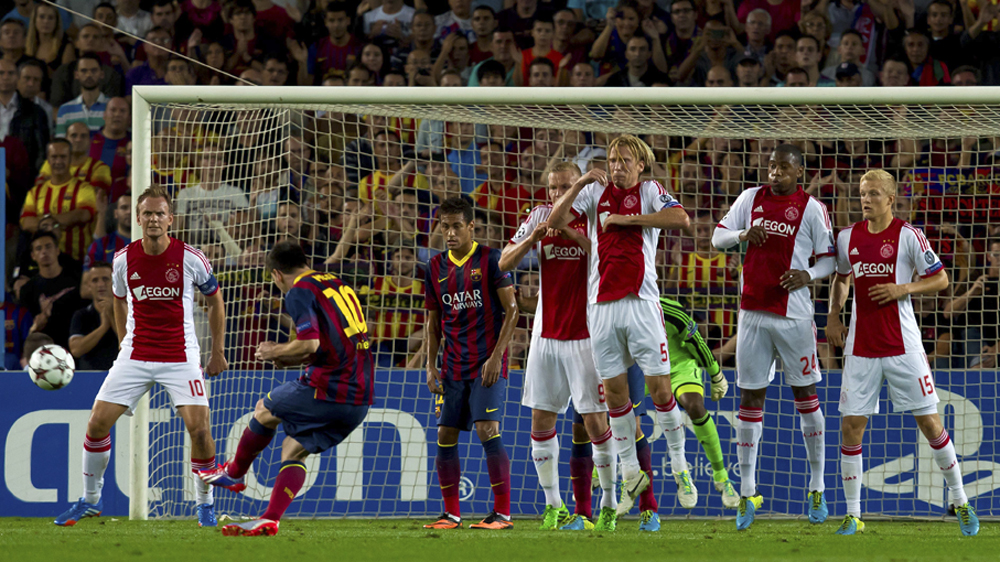Messi recebe na meia-lua. Nenhum jogador do Ajax chega para marcar, facilitando o trabalho do atacante, que se ajeita, escolhe o canto e chuta rasteiro, no canto esquerdo de Vermeer.