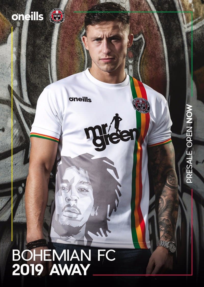 Além de um ícone da música, Bob Marley também era completamente apaixonado por futebol – em ligação forte que já contamos aqui na Trivela. E, por mais aleatório que possa parecer, a imagem da lenda do reggae também passará a figurar em campo nesta temporada. Tradicional clube irlandês, o Bohemian decidiu homenagear o jamaicano. A face de Marley aparece na nova camisa reserva da equipe, com as cores do reggae em detalhes na manga e também em uma faixa sobre o escudo do clube.