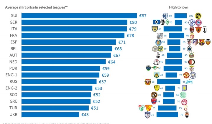 A camisa mais cara da Europa é a do Campeonato Suíço. O estudo recolheu os preços publicados nos sites oficiais dos times em outubro de 2017. Em média, o uniforme suíço custa € 87 euros. O mais barato, entre as principais 16 ligas do continente, é o da Ucrânia, ao preço médio de € 43. Não à toa, o clube que cobra o maior preço pela sua camisa é suíço: o Young Boys, a € 102. O pódio é completado por Alemanha (€ 80) e Itália (€ 79).