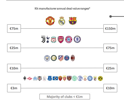 Manchester United, Real Madrid e Barcelona estão no primeiro patamar dos acordos de fornecimento de material esportivo, aponta um relatório detalhado da Uefa que analisou as finanças de 268 clubes nas 16 principais ligas europeias, referente ao ano fiscal de 2016, com acordos que lhe rendem anualmente entre € 75 milhões e € 150 milhões. Representa dez vezes mais do que muitos rivais domésticos e 100 vezes mais do que a maioria dos menores clubes das suas ligas.