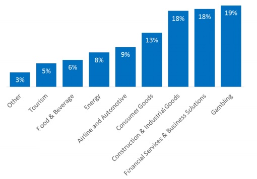 A Uefa conseguiu dividir todas as marcas que patrocinam clubes de futebol em oito indústrias diferentes, e nenhuma realmente controla o mercado. As mais presentes são as empresas de apostas, com 19% dos clubes. Em seguida, aparecem serviços financeiros e “soluções empresariais” e construção e bens industriais, com 18% cada. Bens de consumo estão em quarto lugar (13%), seguido por companhias aéreas e indústria automotiva (9%), energia (8%), comidas e bebidas (6%) e turismo (5%).