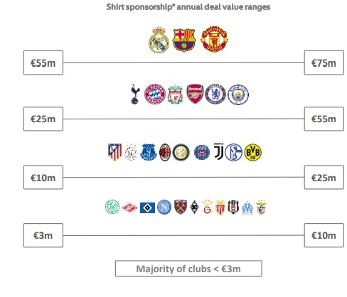 A Uefa mergulhou nos patrocinadores das camisas dos clubes europeus e descobriu que Manchester United, Barcelona e Real Madrid também lideram a indústria com os acordos de patrocínio mais valiosos, entre € 55 milhões e € 75 milhões anuais. Tottenham, Bayern de Munique, Liverpool, Arsenal, Chelsea e Manchester City aparecem na segunda faixa de preço, de € 25 milhões a € 55 milhões. Atlético de Madrid, Ajax, Everton, Milan, Internazionale, PSG, Juventus, Schalke e Borussia Dortmund recebem de € 10 milhões a € 25 milhões. Outros 11 clubes ficam entre € 3 milhões e € 10 milhões por ano, e a maioria dos clubes não chega a € 3 milhões.