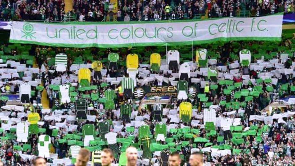 Em meio ao mosaico, os torcedores ergueram réplicas de várias camisas e calções que o Celtic usou ao longo de seus 117 anos. O verde predomina, é claro, mas em vários tons, misturado com o branco. Além disso, o amarelo e o preto também aparecem entre as tradições. Nada como demonstrar a paixão, destacando também a rica história do clube escocês.