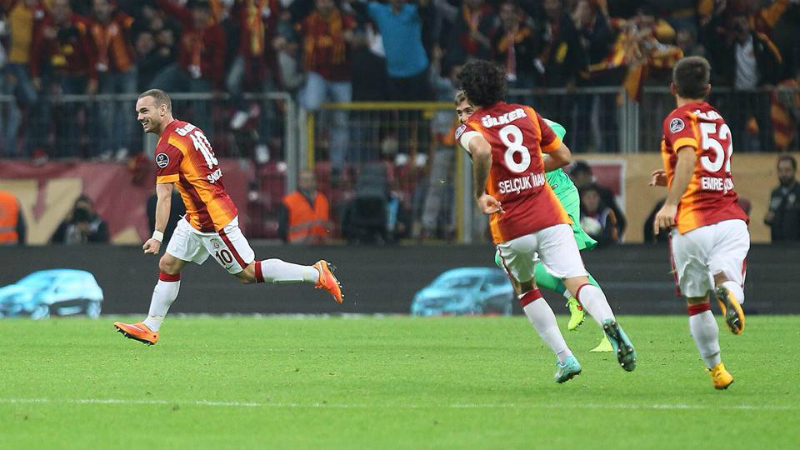 Sneijder não vive o melhor momento de sua relação com o Galatasaray, mas nem por isso deixou de se doar para o time no clássico com o Fenerbahçe, neste sábado. Muito pelo contrário, fez até questão de ser o grande herói da vitória por 2 a 1, na Türk Telekom Arena. Já nos minutos finais, o jogo parecia se encaminhar para um empate sem gols, até que o holandês apareceu com uma de suas melhores qualidades, o chute de longa distância, para decidir o jogo. Foram dois golaços, aos 43 e 46 minutos, para definir o importante triunfo por 2 a 1 – Potuk diminuiu para o Fener no último lance da partida.