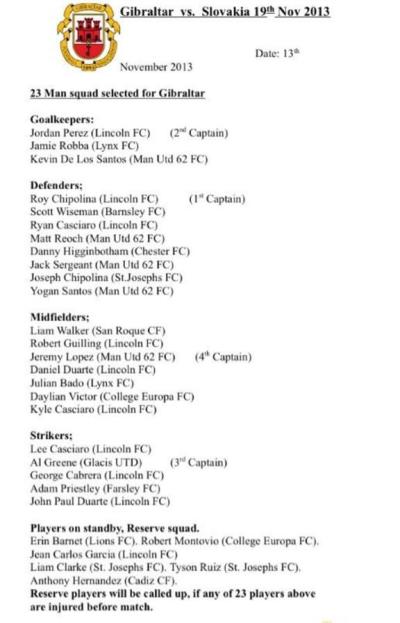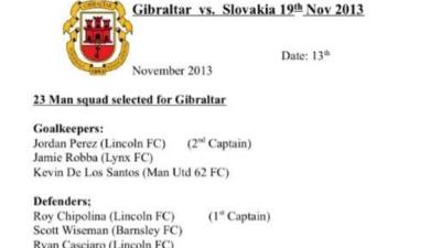 Abaixo, a convocação completa da seleção de Gibraltar:
