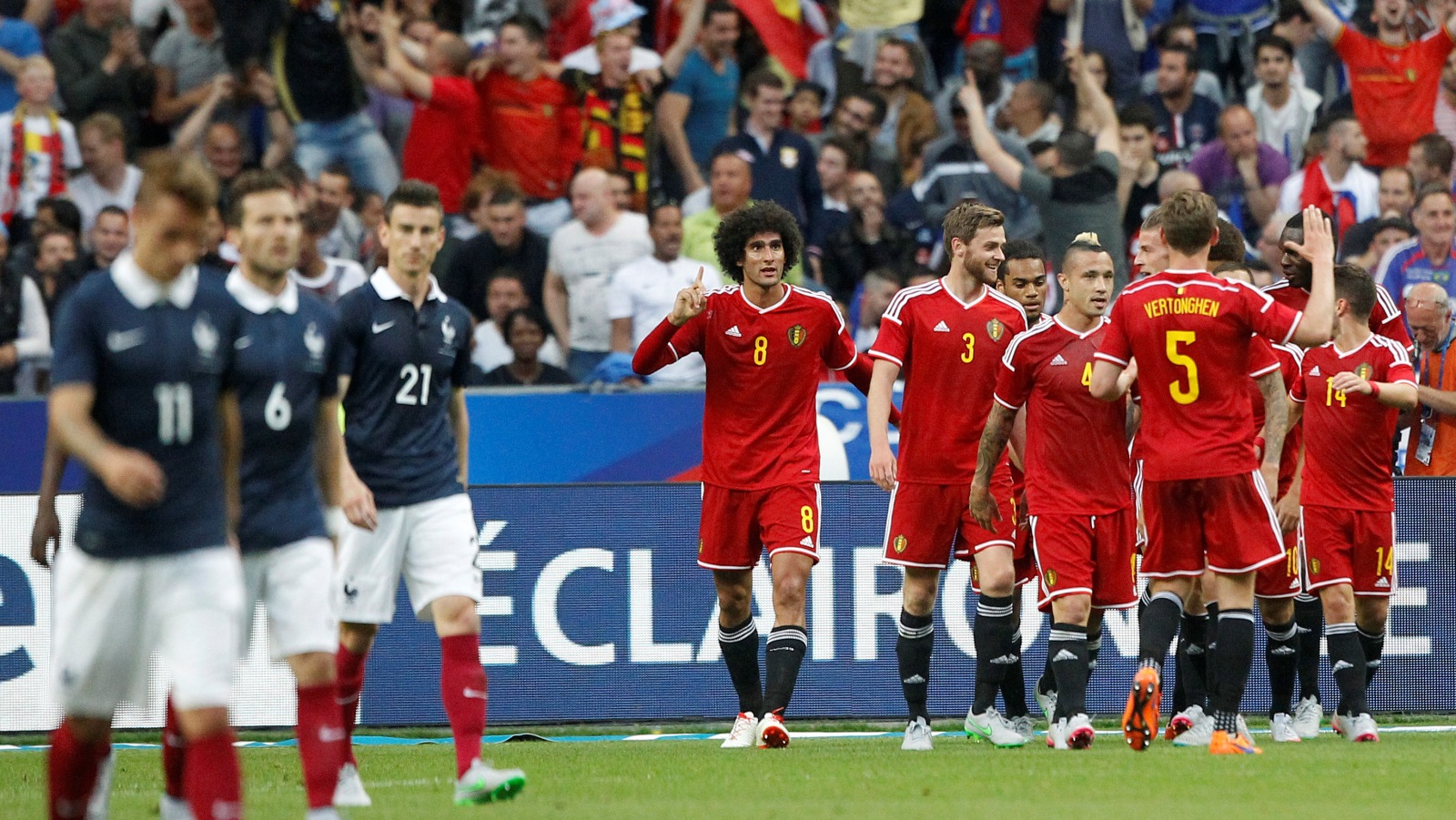Vale ponderar, a França não tinha a sua escalação completa. Faltavam especialmente os dois principais destaques individuais do bom time de Didier Deschamps: Karim Benzema e Paul Pogba. Já do outro lado, a Bélgica também não contou com Vincent Kompany e Kevin De Bruyne. Mas Marc Wilmots tinha Marouane Fellaini. E o meio-campista do Manchester United foi decisivo no primeiro tempo, marcando os dois gols dos belgas – o primeiro, em posição irregular. Enquanto os Bleus tentavam trabalhar um pouco mais a bola, sem sucesso, os Diabos Vermelhos eram bem mais diretos e ameaçavam bastante no jogo aéreo.