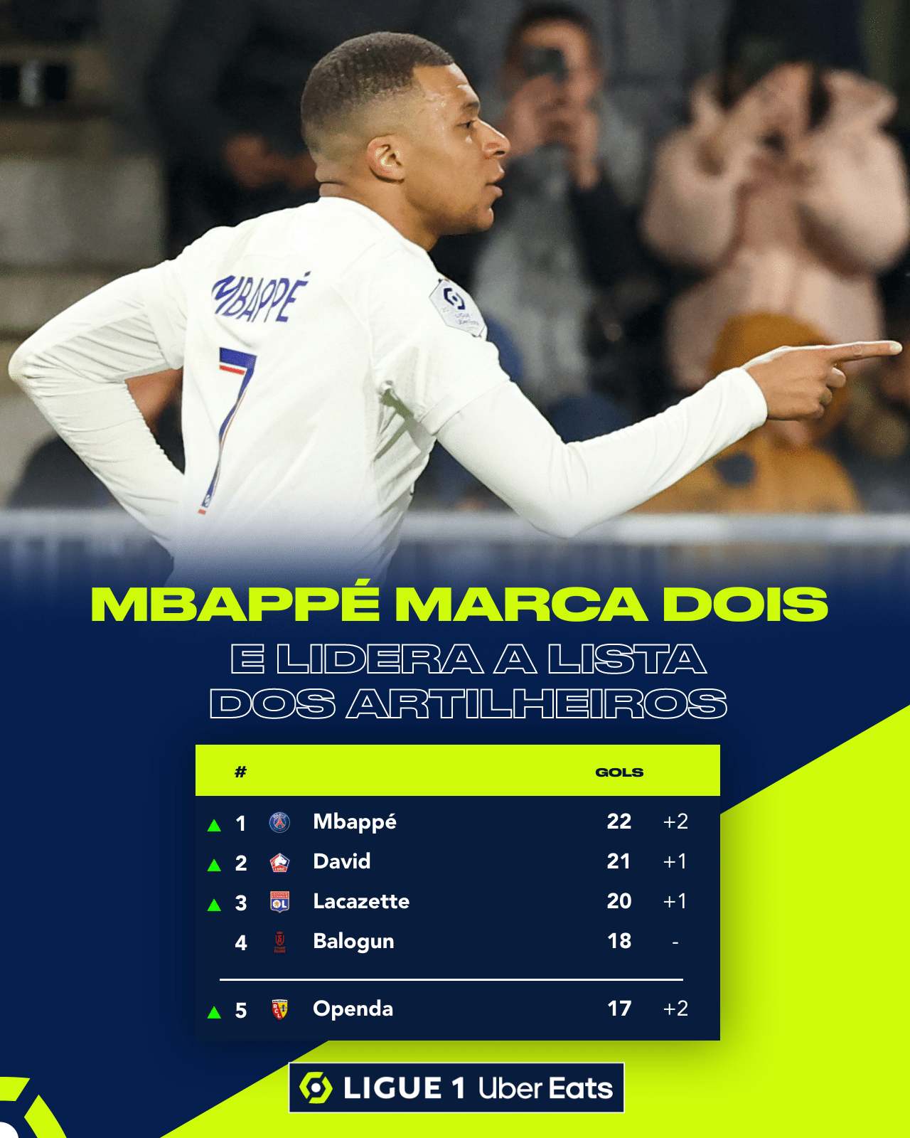 Mbappé, que vem num ritmo mais devagar do que nas últimas temporadas na Ligue 1, marcou dois gols na rodada e se tornou artilheiro isolado da competição.