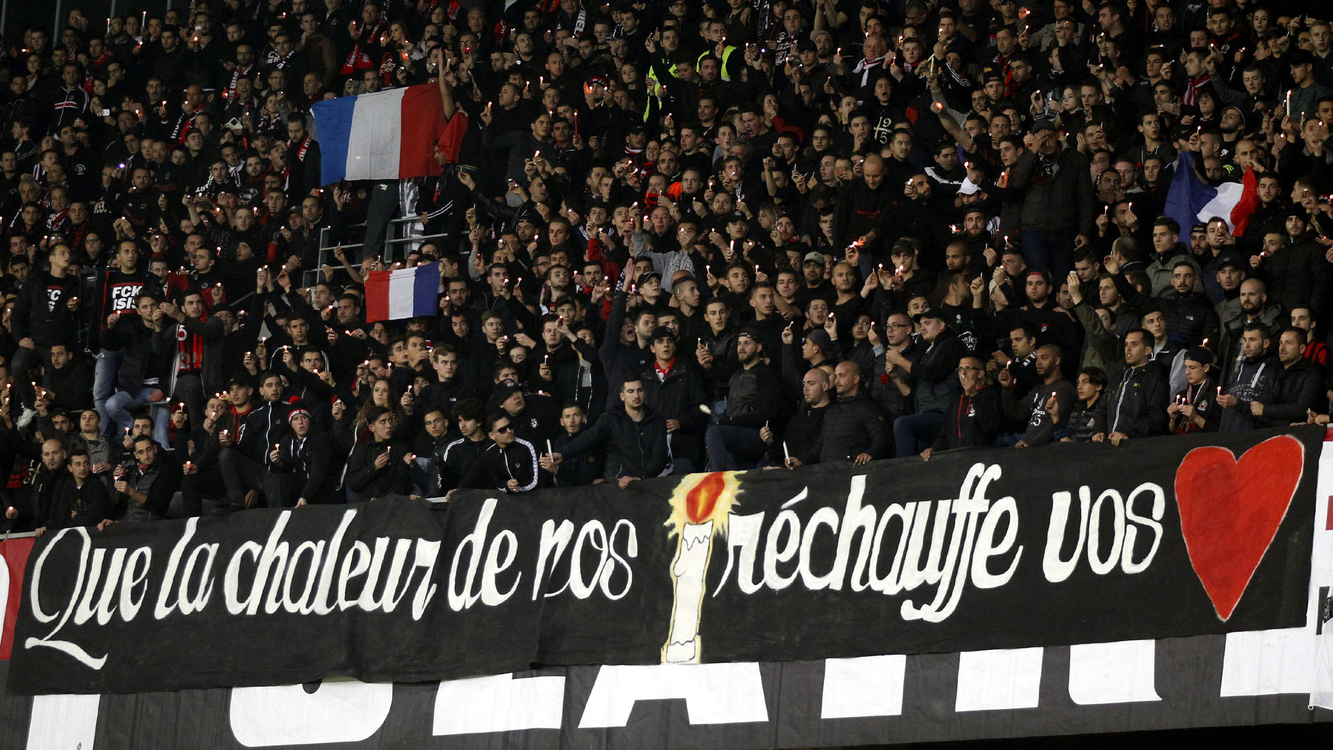 A manifestação aconteceu na partida do Nice com o Lyon, nesta sexta-feira, que abriu a 14ª rodada da Ligue 1. O Nice venceu por 3 a 0, mas antes do jogo houve homenagens dos torcedores às vítimas dos atentados de Paris, com um minuto de silêncio antes do apito inicial e ainda velas e vigília em volta do estádio.