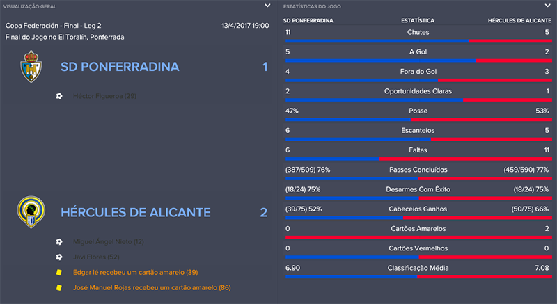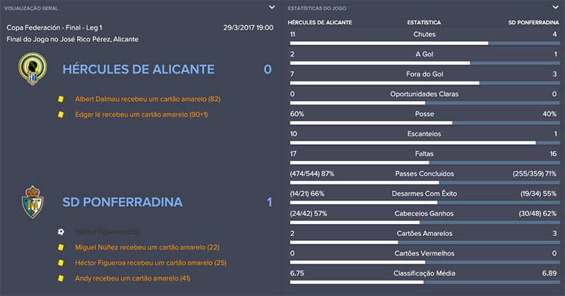 A proposta de jogo contra o Cornellà foi vista já no início do jogo de volta contra o Ponferradina, pela final da Copa. Com Daulmal suspenso, Ié foi jogar na lateral direita. Isso prejudicava quem precisava de gols, mas não na prática. Foi dos pés de Ié que surgiu o chute na trave de Arthuro, que gerou o rebote bem aproveitado por Nieto: 1 a 0, Hercules. Aos 28, Omgba perdeu a bola no meio campo, e após um lançamento Figueroa chutou da entrada da área de forma indefensável: 1 a 1.Aos 36, Arthuro acertou a trave novamente, e este foi o último lance agudo do primeiro tempo.