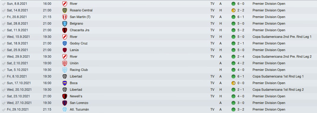 - Bom, começamos o Apertura 2021 com uma sequência de quatro vitórias em cinco jogos. Ganhamos do River e do San Martín por 6 a 0, do Belgrano por 5 a 0, do Chacarita Juniors por 5 a 2 e empatamos com o Rosario Central por 2 a 2.