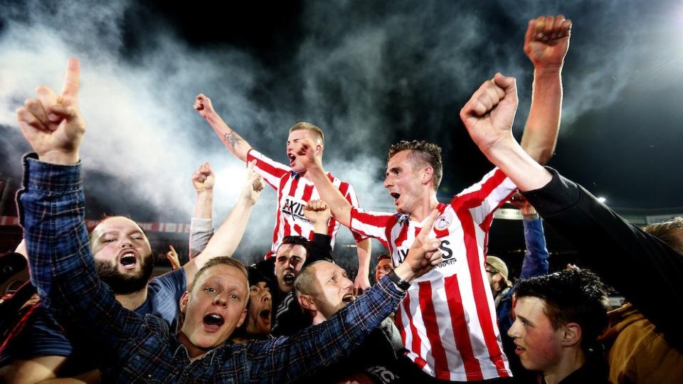 Foi, aliás, o que possibilitou ao Sparta Rotterdam garantir o título na 35ª rodada, a quatro do final da temporada regular: a equipe tinha 32 partidas, uma a menos do que o VVV-Venlo, vice-líder com sete pontos atrás dos Rotterdammers. E seria justamente a equipe da cidade de Venlo a folgar na rodada. Bastava vencer o Jong Ajax que o título viria para os Kasteelheren (em holandês, “donos do castelo” – referência a Het Kasteel, estádio do Sparta). E venceram, no 3 a 1 citado no início desta coluna, abrindo dez pontos de vantagem a três rodadas do fim do torneio regular. A torcida não poupou na comemoração: invadiu o gramado para festejar o título.