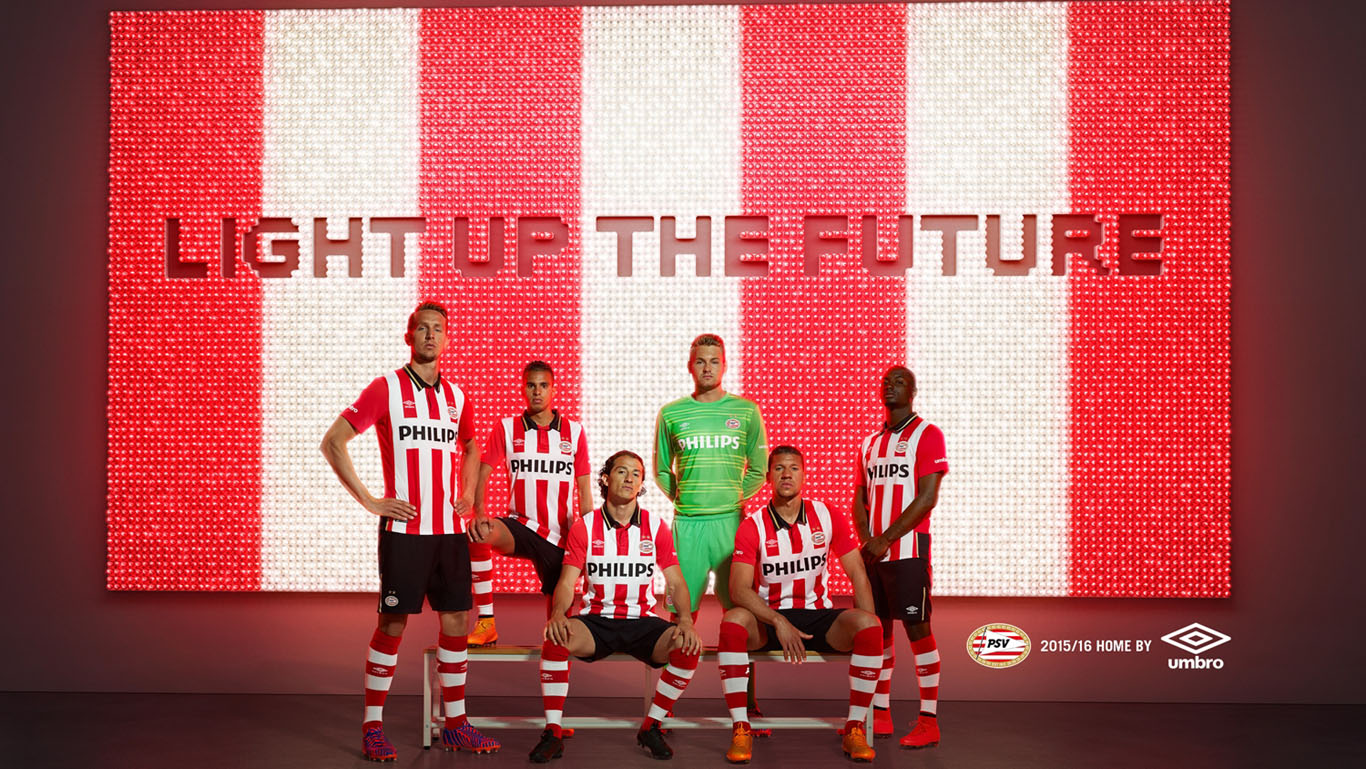 A Umbro caprichou nos novos uniformes do PSV, atual campeão holandês. A camisa listrada em vermelho e branco mantém um padrão tradicional, com a volta de uma gola preta, já usada em temporadas anteriores. A campanha de lançamento teve como mote “Light Up The Future” (como você lê na imagem de abre) e, na verdade, não quer dizer nada além de uma longa parceria entre o clube e a fornecedora de material esportivo, um contrato de cinco anos.