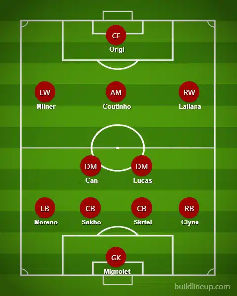 - Mignolet; Clyne, Skrtel, Sakho e Moreno; Lucas Leiva e Can; Lallana, Milner e Philippe Coutinho; Origi.