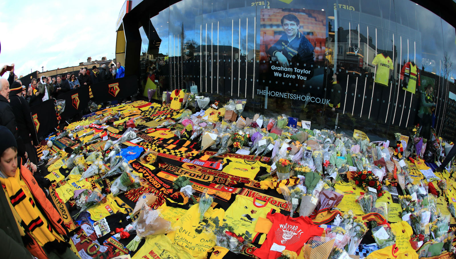 Diante de tudo isso, é até natural que as homenagens a Taylor tenham sido amplas neste final de semana. Não só os jogos da Premier League, mas também de divisões inferiores na Inglaterra respeitaram um minuto de silêncio ao treinador e exibiram sua imagem nos telões. As maiores emoções, logicamente, aconteceram em Vicarage Road. Torcedores do Watford levaram camisas, cachecóis e flores para depositar na entrada do estádio. O programa do jogo contra o Middlesbrough foi todo para homenagear ‘o maior técnico da história dos Hornets’, enquanto as bandeiras de escanteio eram negras. Nas arquibancadas, a torcida ainda fez um bandeirão e um mosaico. Rita, a viúva de Taylor, não conteve as lágrimas. Já na segunda divisão, coincidentemente, Wolverhampton e Aston Villa se enfrentaram, dois ex-clubes do técnico. Uniformes feitos com flores serviram para o tributo.